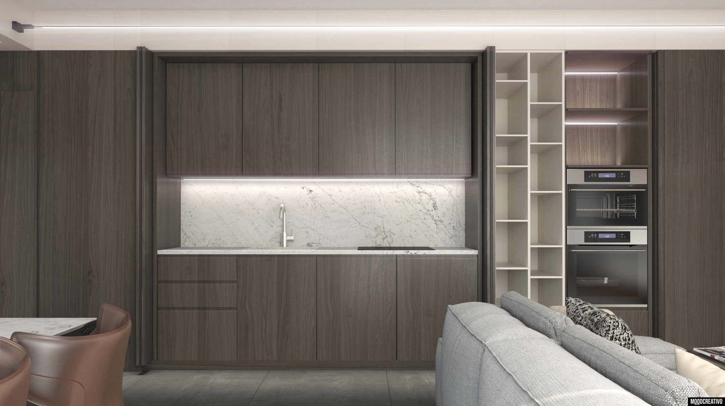 In questo progetto la cucina c’è e si vede solo all’occorrenza, questo è stato il punto di partenza di tutto lo sviluppo della zona giorno.
